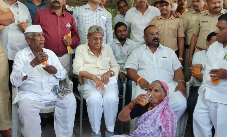 राहुरी : कृषी विद्यापीठाच्या प्रकल्पग्रस्त उपोषणकर्त्यांना ज्युस देऊन, उपोषण सोडवितांना माजी खासदार प्रसाद तनपुरे व रावसाहेब खेवरे.
