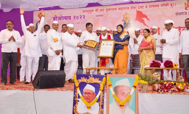 लोणी बुद्रुक जि. अहमदनगर येथे सुरु असलेल्या तुकाराम बिजोत्सव २०२२ निमित्त आयोजित ग्रंथराज ज्ञानेश्वरी पारायण, भागवताचार्य रुक्मिनीताई हावरे यांच्या श्री विठ्ठल चरित्र कथा सोहळ्याची सांगता वरदविनायक सेवाधामचे मठाधिपती मंहत उध्दव महाराज मंडलिक नेवासेकर यांच्या काल्याच्या किर्तनाने सोमवारी झाली.जगद्गुरू श्री संत तुकाराम महाराज सेवा ट्रस्ट व लोणी बुद्रुक ग्रामस्थानी सोहळ्याचे आयोजन केले होते. त्यांच्या वतीने दिला जाणारा पद्मभूषण डॉ. बाळासाहेब विखे पाटील स्मृती संत सेवा पुरस्कार २०२२ याच सोहळ्यात शांतीब्रम्ह,समन्वय महर्षी, गुरुवर्य मारुतीबाबा कु-हेकर यांना माजी मंत्री अण्णासाहेब म्हस्के पाटील,जिल्हा परिषदेच्या माजी अध्यक्षा शालिनीताई विखे पाटील,ध्रुव विखे पाटील,महंत उद्धव महाराज मंडलिक यांच्या हस्ते प्रदान करण्यात आला.स्मृतिचिन्ह,मानपत्र व २५ हजार रुपये असे या पुरस्काराचे स्वरूप आहे.गेल्या पाच वर्षांपासून हा पुरस्कार दिला जातो.