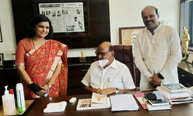 अहमदनगर जिल्हा कॉंग्रेसचे सरचिटणीस व श्रीरामपूर पं.स. सभापती डॉ. वंदनाताई मुरकुटे यांनी काल मुंबई येथे यशवंतराव चव्हाण प्रतिष्ठानच्या कार्यालयात शरद पवार यांची भेट घेवून विविध विषयांवर चर्चा केली त्यावेळी श्री. पवार बोलत होते. प्रारंभी मुरकुटे दाम्पत्यांनी डॉ. वंदना मुरकुटे यांनी लिहिलेल्या “योगीराज गंगागिरी ते सद्गुरू नारायणगिरी महाराज” या पुस्तकाची प्रत श्री. पवार यांना दिली त्यावेळी त्यांनी सराला बेटाबद्दलची संपूर्ण माहिती जाणून घेतली. राजकीय क्षेत्रातील व्यक्ती सवड काढून लिखाण करतात ही कौतुकाची बाब असल्याचे श्री. पवार म्हणाले. राजकीय क्षेत्रातील कार्यकर्त्यांनी राजकारण कमी व समाजकारण जास्त करावे, विविध विषयांवरील पुस्तकांचे वाचन करून शब्दसंपदा वाढवावी. असे सांगितले.