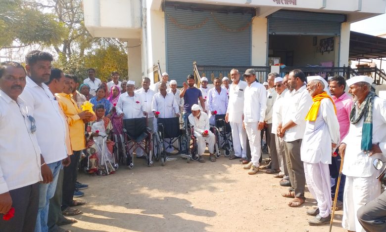 येथील ६० वर्षांवरील १५० वयोवृद्ध नागरिकांना चाकांची घडीची खुर्ची, काठी, श्रवण यंत्र, चष्मा, वाॅकर, कुबड्या, कृत्रीम दात, मान, पाठ, गुडघ्यांचा पट्टा आदी साहित्यांचे वाटप करण्यात आले आहे.