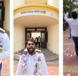 विहिरीसाठी लाच मागितलि म्हणून चक्क दोन लाख रुपये पंचायत समिती समोर उडवत सरपंचाने आंदोलन
