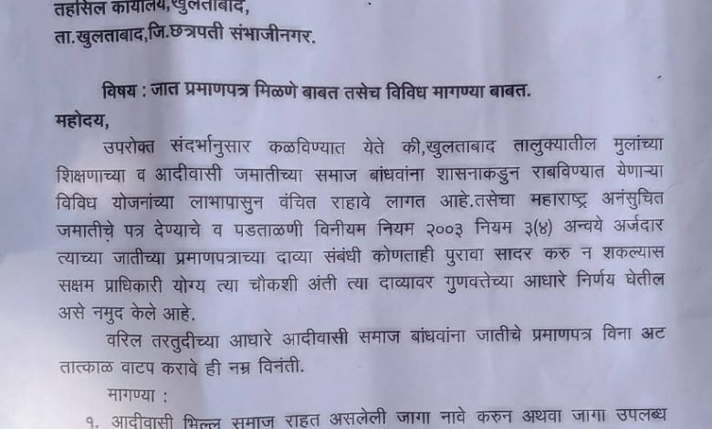 आदिवासी समाजाच्या मागण्या साठी खुलताबाद तहसीलदार यांना निवेदन.