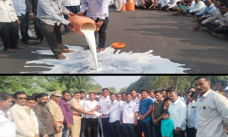 रास्तारोको प्रसंगी रस्त्यावर दुध ओतुन कंपनी धार्जीण्या सरकारचा दुध उत्पादकांकडून निषेध