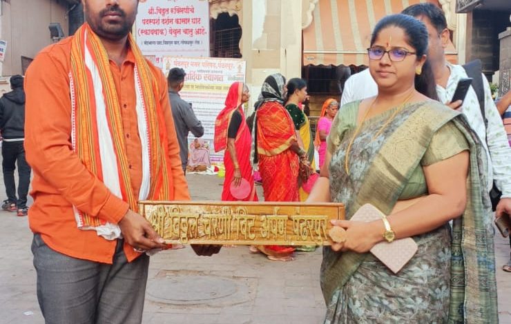 पंढरपूरच्या पांडुरंगाला सागवानापासून कोरीव निर्माण केलेली पादुकांची वीट विठ्ठला चरणी अर्पण.